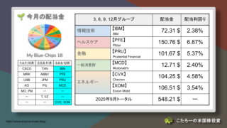 配当実績 【米国株配当基盤】今月の配当金 7万6千円(2025年9月) こんにちは、こたろーです。 米国株の高配当株・連続増配株に投資して、不労所得を得るための配当基盤を構築しています。 この記事では、わたしの配当株投資の今月の配当実績について書きます。 【高配当株投資】配当金報告 ... 2025.10.11 配当実績