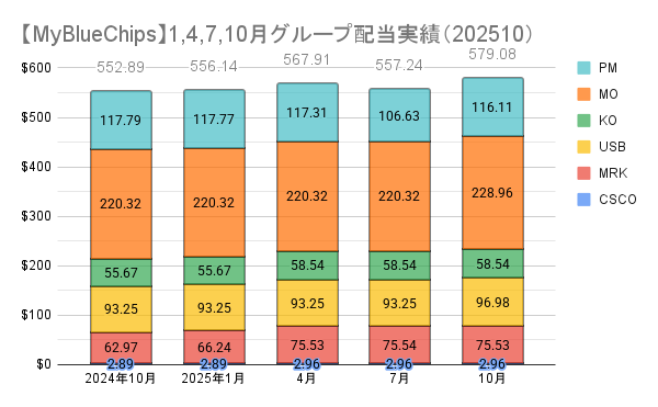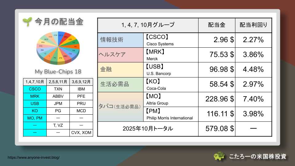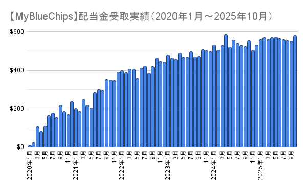 2025年10月は合計「579.08ドル」の配当金をいただきました。約81,000円です。